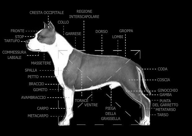 L'American Staffordshire Terrier deve dare l'impressione di una grande forza rispetto alla sua taglia. É un cane ben costruito, muscoloso ma agile ed elegante, attento, vigile e reattivo a ciò che lo circonda. Deve essere massiccio, non alto sugli arti o snello nei profili.