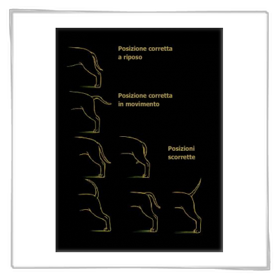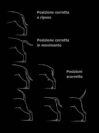 Corta in rapporto alla taglia, attaccatura bassa, va ad assottigliarsi verso un'estremità sottile. Non è arrotolata o portata al di sopra del dorso. Non viene tagliata.